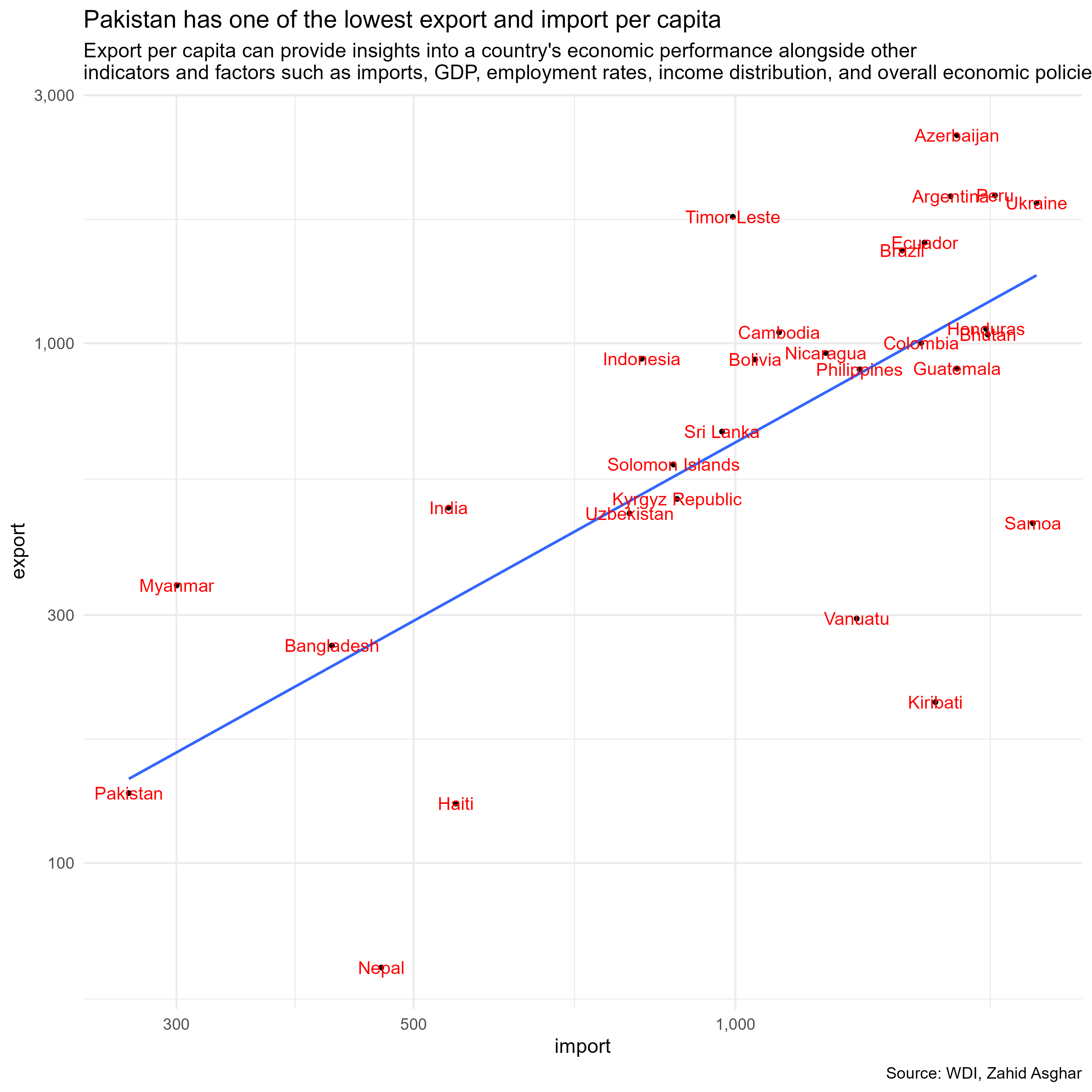 In this post, I will examine India, Pakistan, Sri Lanka, and Bangladesh exports and imports from 1980 to 2023. Exports are a crucial indicator of a country’s competitiveness in the global market, while imports reflect the level of consumption and dependence on foreign goods and services. A healthy economy often features high exports supporting its imports, signifying robust economic growth. Additionally, I will include an analysis of exports per capita, which provides a more granular view of economic performance by reflecting the average export value per person. I will also delve into how Pakistan's performance in terms of exports and imports as a percentage of GDP and exports per capita compared to that of India, Sri Lanka, and Bangladesh.