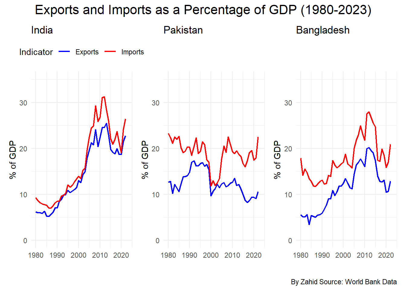 Figure 6 illustrate the trends in exports and imports as a percentage of GDP for India, Pakistan, and Bangladesh from 1980 to 2023.