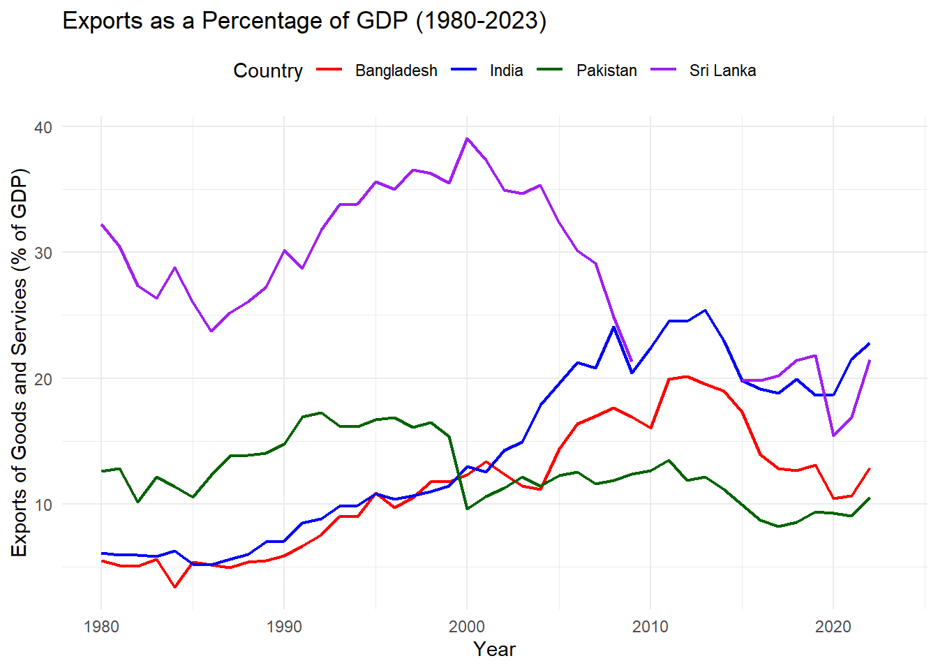 labs(title = "Exports as a Percentage of GDP (1980-2023)",
