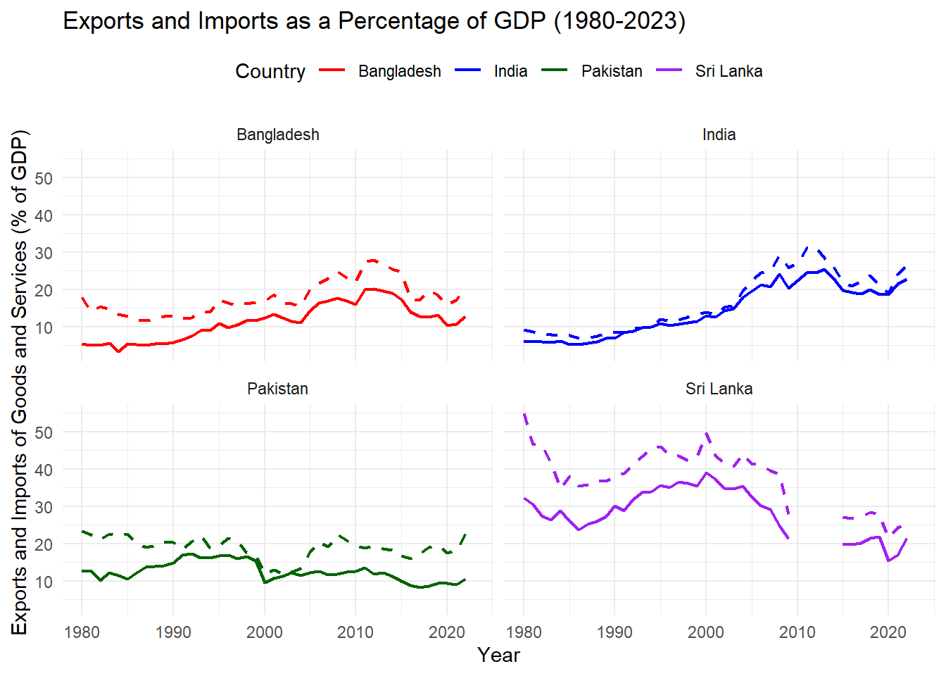 Lets plot exports and imports as a percentage of GDP for India, Pakistan, Sri Lanka, and Bangladesh.