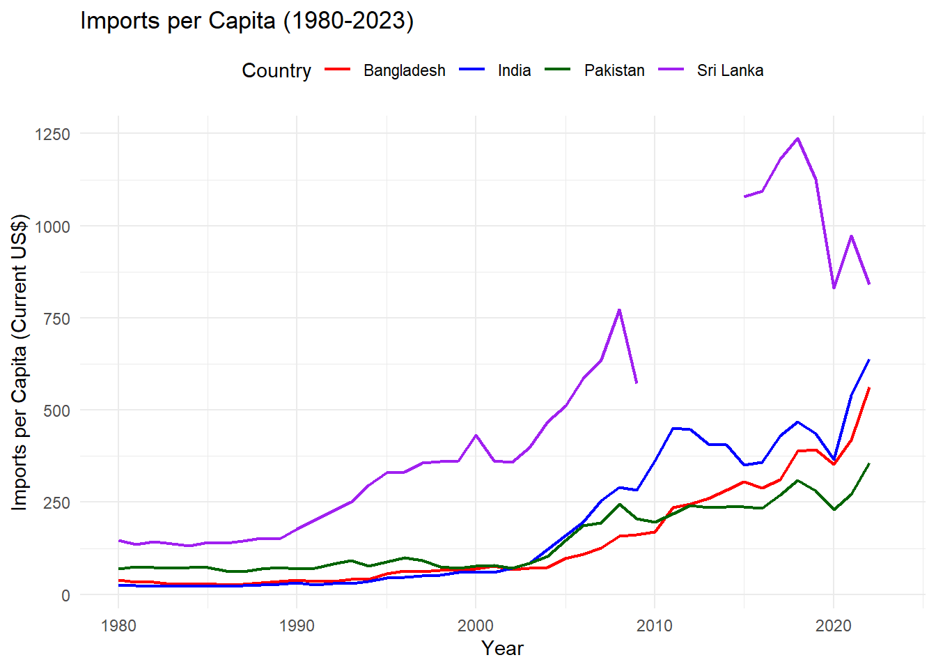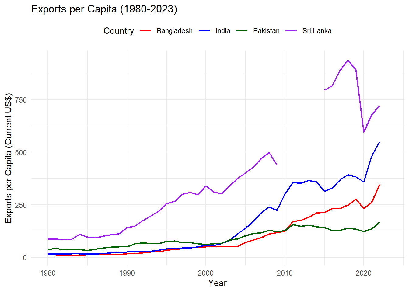scale_color_manual(values = c("Pakistan" = "darkgreen", "India" = "blue", "Bangladesh" = "red", "Sri Lanka"="purple")) +